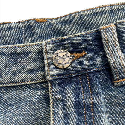 100% cotton washed denim, red butterfly print overlay